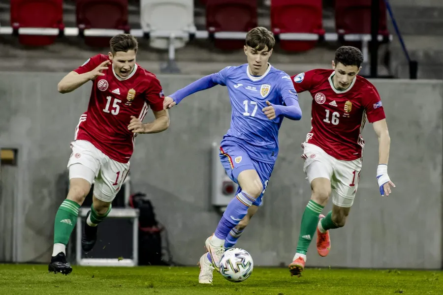 Octavian Popescu (C) in meciul de fotbal dintre Ungaria U21 si Romania U21 (echipament albastru) din grupa A de la EURO U21, disputat pe Bozsik Arena din Budapesta, Ungaria, sambata, 27 martie 2021. VIORICA PANA / MEDIAFAX FOTO