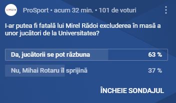 Doar 37% dintre urmăritorii emisiunii au fost de părere că Mihai Rotaru, patronul Universității Craiova, îl va sprijini în continuare pe Mirel Rădoi.